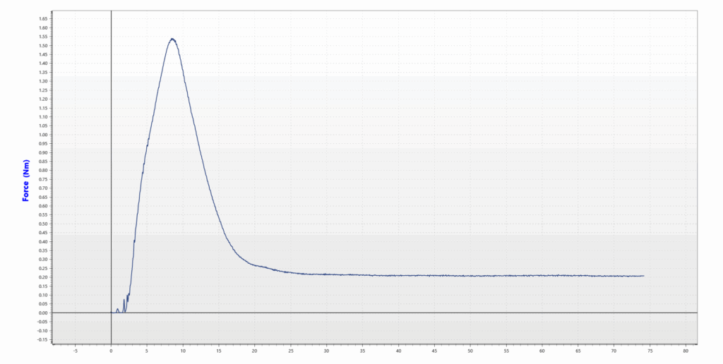 In screw cap opening torque measurements, the torque curve typically follows the pattern shown in the graph below. Therefore, the peak value is often managed as a key parameter. Companies check whether the peak value is within predefined limits.