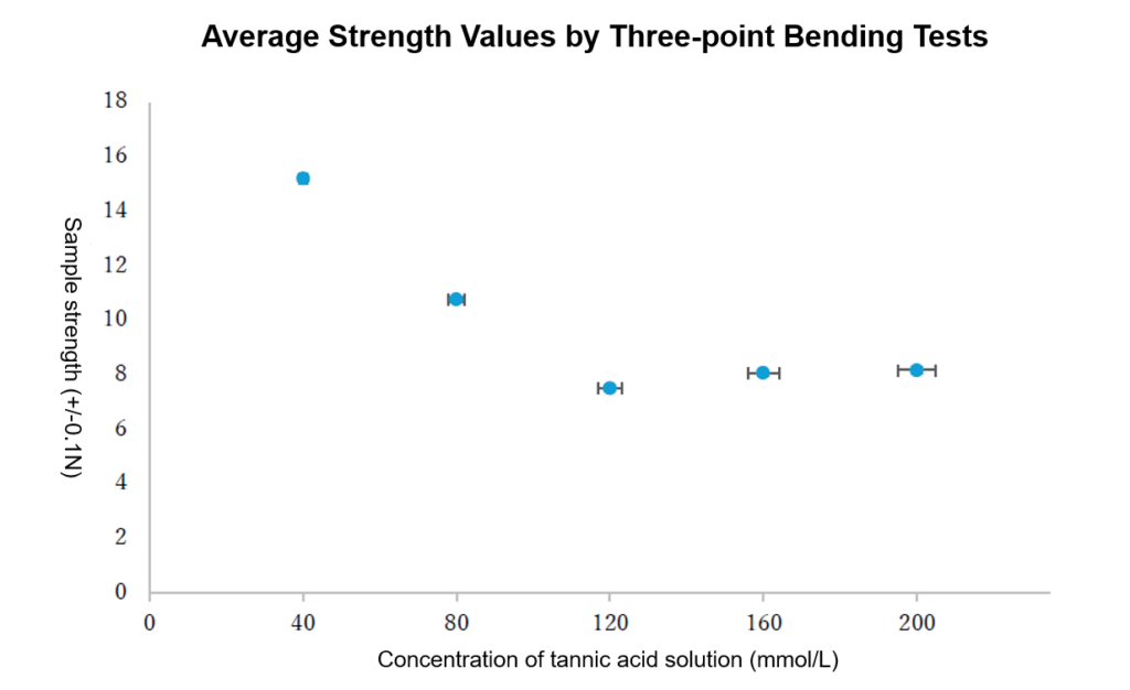 To her surprise, the sample with the lowest tannic acid concentration mixture, 40 mmol/L, produced the value of the highest strength. “It may be due to the possibility that adding too much tannic acid would saturate the binding sites or cause aggregation of tannic acid molecules,” and she also added that she would like to challenge further investigation on the strength caused by the lower tannic acid concentration.