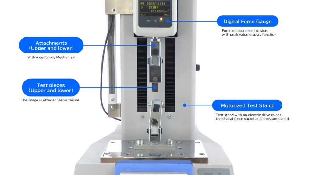 In adhesive strength tests, the force values to be measured often exceed 500N. For this reason, testing equipment with an electric drive (force gauge + motorized test stand, etc.) is often used. For force gauges, it is recommended to use a digital force gauge with excellent sampling speed in order to accurately measure breaking strength. In addition, the test jig must have a mechanism that applies a tensile force perpendicular to the adhesive surface. The test procedure is quite simple and is as follows:
