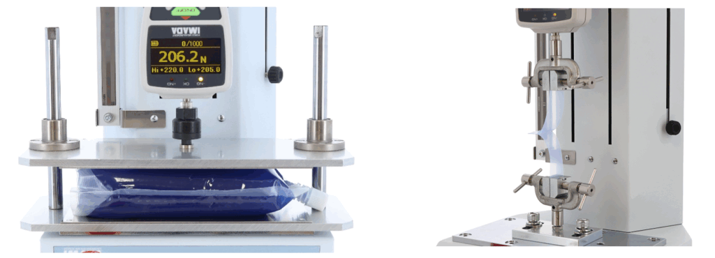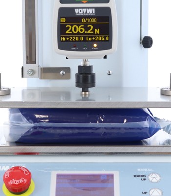 耐圧縮試験とシール強度は、荷重に対するシール部の強度評価を目的とした試験です。包装容器の基本的な役割である内容物の保護という点において、強度を正しく管理することは非常に重要です。どちらの試験も荷重測定器(フォースゲージ)などの、測定機器を使用して行われます。