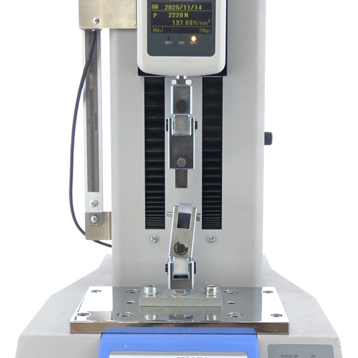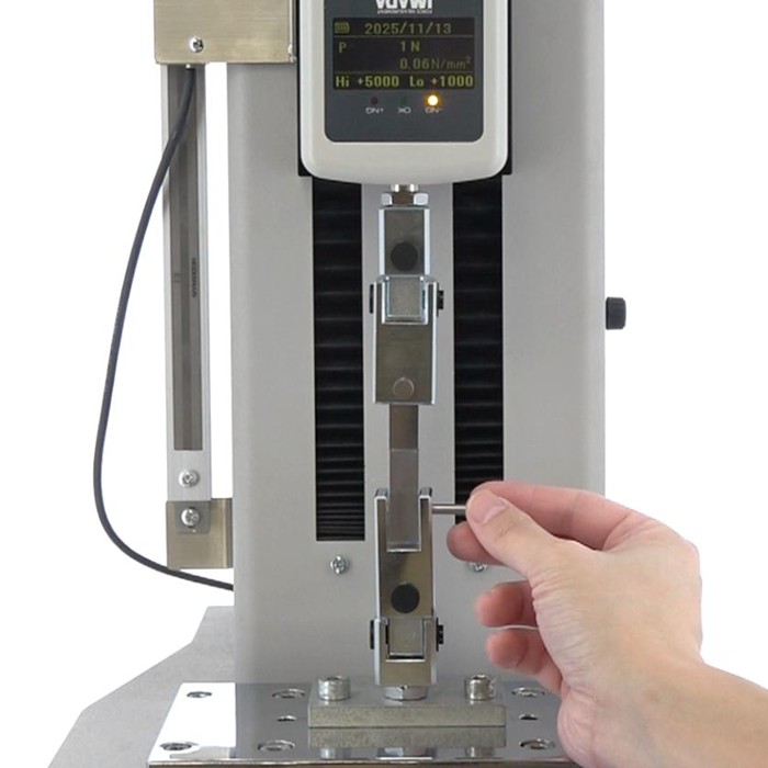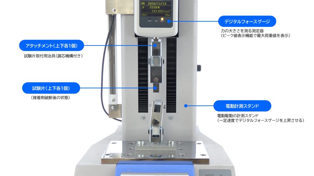 接着剤の強度試験では、測定する荷重値が500Nを超えることも少なくありません。そのため、多くの場合、電動の駆動部を持った試験機器(荷重測定器+電動計測スタンドなど)を使用します。荷重測定器については、正確な破壊強度を測定するためにも、サンプリング速度に優れたデジタルフォースゲージの使用が推奨です。また試験治具には、接着面に対して垂直に引張荷重が負荷されるような機構が求められます。試験手順は至って単純で、次のとおりです。